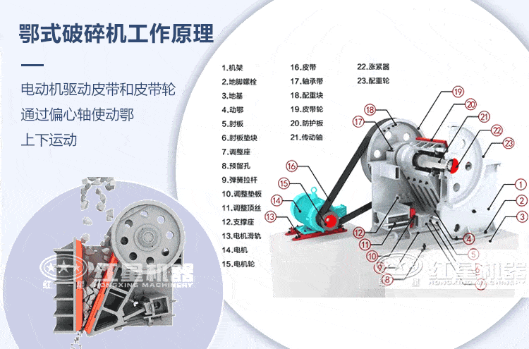 電動機驅動皮帶和皮帶輪,通過偏心軸使動鄂上下運動,當動鄂上升時肘板與動鄂間夾角變大,從而推動動鄂板向固定鄂板接近,與其同時物料被壓碎或劈碎,達到破碎的目的;當動鄂下行時,肘板與動鄂夾角變小,動鄂板在拉桿彈簧的作用下,離開固定鄂板,此時已破碎物料從破碎腔下口排出。隨著電動機連續轉動而破碎機動鄂作周期運動壓碎和排泄物料,實現鄂式破碎機的批量生產。